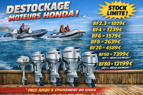 Destockage moteur Honda Marine :  En stock : ↓  BF2.3 court / long = 1029 € BF4 court = 1239 € BF6 court / long avec système charge (vendu sans batterie) = 1579 € BF20 court =  4589 € BF50 long = 7399 €* BF80 long = 12199€ *     * Vendu avec 2 compteurs, un boitier latéral et une hélice en aluminium, hors pose Tarif applicable jusqu'à épuisement des stocks