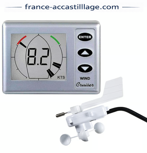NASA CRUISER Girouette anémomètre V2 Ce pack contient un afficheur Cruiser V2, un indicateur et un capot de protection. L'afficheur Cruiser V2 de Nasa vous donne la direction et la vitesse du vent avec une parfaite lisibilité grâce à ses chiffres de 38 mm. La girouette anémomètre NASA de Cruiser fournit des indications sur le vent apparent. Vous pourrez connaître la direction du vent sur 360°, la vitesse et la tendance de vitesse. Son afficheur analogique ultra-lumineux offre une lisibilité exceptionnelle. Vous apprécierez la lisibilité exceptionnelle de cet afficheur grâce à ses lettres d'une taille de 32mm. Cet afficheur a été conçu pour affronter les temps humides et pluvieux de part sa robustesse. Il est possible de régler l'écran avec 7 niveaux de rétro-éclairage. Il dispose d'un port NMEA0183-4800bds (phrase MWV). Cette girouette anémomètre donne les indications relatives au vent apparent : la direction du vent sur 360°, la vitesse (nœuds, miles ou mph) et la tendance de vitesse (accélération / décélération). Doté du protocole NMEA 0183, la girouette peut être couplée à votre logiciel de navigation. Livré avec un câble de 20 mètres allégé et plus fin que la précédente génération. Encore + simple à installer dans votre mât. |