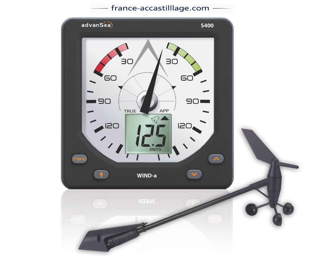 Girouette à affichage analogique. Vitesse de 0 à 199 nœuds, direction du vent, indication de tendance, angle et vitesse du vent réel et apparent, alarme vent fort. Résolution 1° en direction. Affichage des caractères 32 mm info principale, 22mm info secondaire. Connexion NMEA 0183 et Bus advanSea.