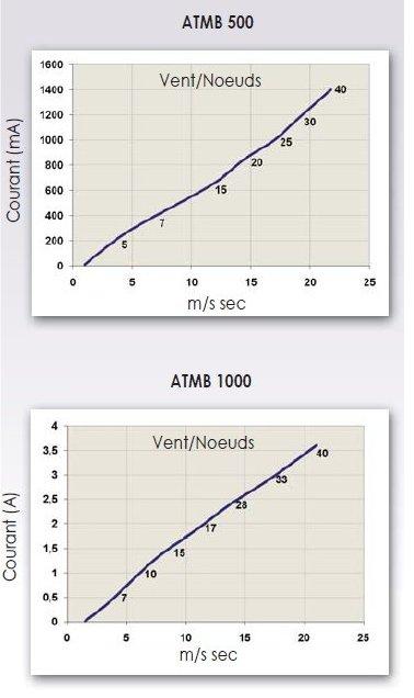 Les modèles 500 et 1000 peuvent fournir avec une vitesse de vent établie de 15 Noeuds 16 et 36 Ampères par 24 Heures.(voir graphiques)