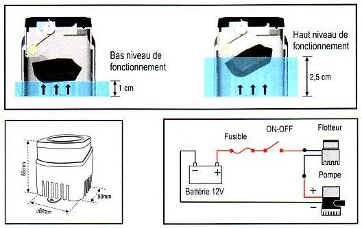 Contacteur à flotteur Lalizas. Ce flotteur déclenche l'interrupteur activant la pompe de cale. Shéma de fonctionnement ci-dessus. |